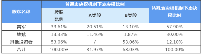 根据招股说明书显示,A类股份持有人每股可投10票,B类股份持有人每股可投1票。在AB股结构下,雷军的31.41%的股份中有20.51%的A类股,加上其10.9%的B类股,雷军的投票权达到了55.7%,再加上委托投票的2.2%,雷军实际拥有公司57.9%的投票权。林斌的13.33%中有11.46%的A类股,加上1.87%的B类股,根据A类股的投票规则,林斌拥有公司30%的投票权。如此一来,雷军的创始团队则拥有公司超过87.9%的投票权,可以决定公司重大事项和一般事项。表决权前后变化情况如下: