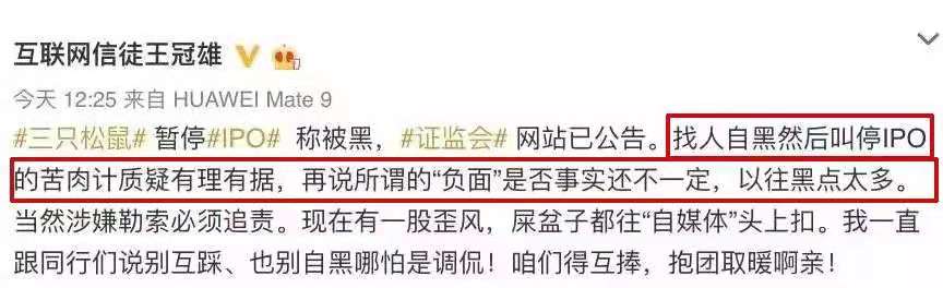 不过有人认为,这是三只松鼠演出的一出苦肉计。互联网人王冠雄说,以往黑点太多,找人自黑然后叫停IPO。