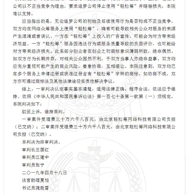“轻松筹”坐上被告席,经过法院一审二审,均败诉。法院判决书显示,轻松筹公司使用“轻松筹”的行为构成不正当竞争,判令其立即停止侵犯商标专用权。