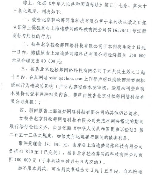 而后,近日,追梦公司起诉轻松筹公司,北京东城区人民法院作出一审判决,认定轻松筹公司侵权,判令其立即停止侵犯追梦公司的商标专用权,赔偿追梦公司经济损失等共计58万元。