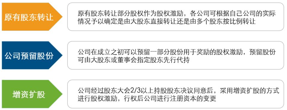 对于非上市公司来说,虽然没有二级市场可供回购股份来用于股权激励,但相对的,非上市公司同时也没有上市公司的诸多监管限制,股权激励的操作比较简单。只要原有股东协商一致,符合《公司法》的要求就可以。这是非上市公司实施股权激励的一个很重要优势。非上市公司激励股权的来源渠道主要有以下三个: