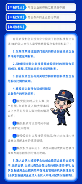 需要注意的是,对于合伙创投企业投资初创科技型企业的,仅强调合伙创投企业投资于初创科技型企业的实缴投资满2年,取消了对合伙人对该合伙创投企业的实缴出资须满2年的要求。比如,某合伙创投企业于2018年12月投资初创科技型企业,假设其他条件均符合文件规定,合伙创投企业的某个法人合伙人于2019年6月对该合伙创投企业出资,2020年12月,合伙创投企业投资初创科技型企业满2年时,该法人合伙人即可在2020年度申报时享受税收优惠政策。