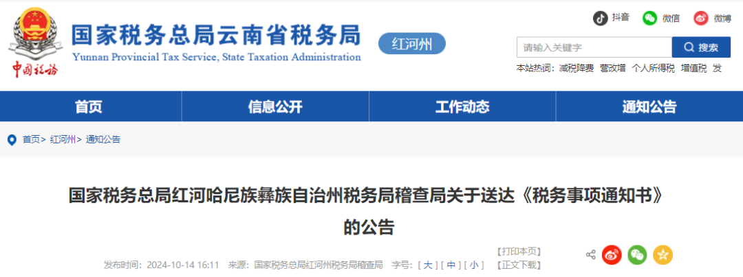 国家税务总局红河哈尼族彝族自治州税务局稽查局税务事项通知书